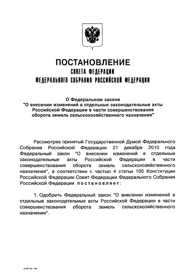 "О ФЕДЕРАЛЬНОМ ЗАКОНЕ "О ВНЕСЕНИИ ИЗМЕНЕНИЙ В ОТДЕЛЬНЫЕ ЗАКОНОДАТЕЛЬНЫЕ АКТЫ РОССИЙСКОЙ ФЕДЕРАЦИИ В ЧАСТИ СОВЕРШЕНСТВОВАНИЯ ОБОРОТА ЗЕМЕЛЬ СЕЛЬСКОХОЗЯЙСТВЕННОГО НАЗНАЧЕНИЯ"