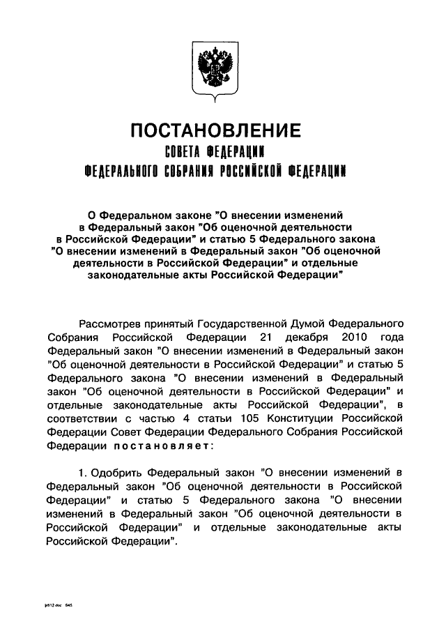 "О ФЕДЕРАЛЬНОМ ЗАКОНЕ "О ВНЕСЕНИИ ИЗМЕНЕНИЙ В ФЕДЕРАЛЬНЫЙ ЗАКОН "ОБ ОЦЕНОЧНОЙ ДЕЯТЕЛЬНОСТИ В РОССИЙСКОЙ ФЕДЕРАЦИИ" И СТАТЬЮ 5 ФЕДЕРАЛЬНОГО ЗАКОНА "О ВНЕСЕНИИ ИЗМЕНЕНИЙ В ФЕДЕРАЛЬНЫЙ ЗАКОН "ОБ ОЦЕНОЧНОЙ ДЕЯТЕЛЬНОСТИ В РОССИЙСКОЙ ФЕДЕРАЦИИ" И ОТДЕЛЬНЫЕ ЗАКОНОДАТЕЛЬНЫЕ АКТЫ РОССИЙСКОЙ ФЕДЕРАЦИИ"