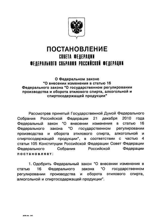 "О ФЕДЕРАЛЬНОМ ЗАКОНЕ "О ВНЕСЕНИИ ИЗМЕНЕНИЯ В СТАТЬЮ 16 ФЕДЕРАЛЬНОГО ЗАКОНА "О ГОСУДАРСТВЕННОМ РЕГУЛИРОВАНИИ ПРОИЗВОДСТВА И ОБОРОТА ЭТИЛОВОГО СПИРТА, АЛКОГОЛЬНОЙ И СПИРТОСОДЕРЖАЩЕЙ ПРОДУКЦИИ"