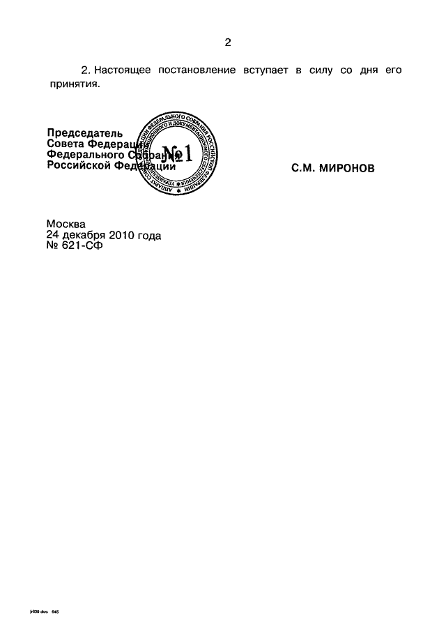 ПОСТАНОВЛЕНИЕ СФ ФС РФ от 24.12.2010 N 621-СФ