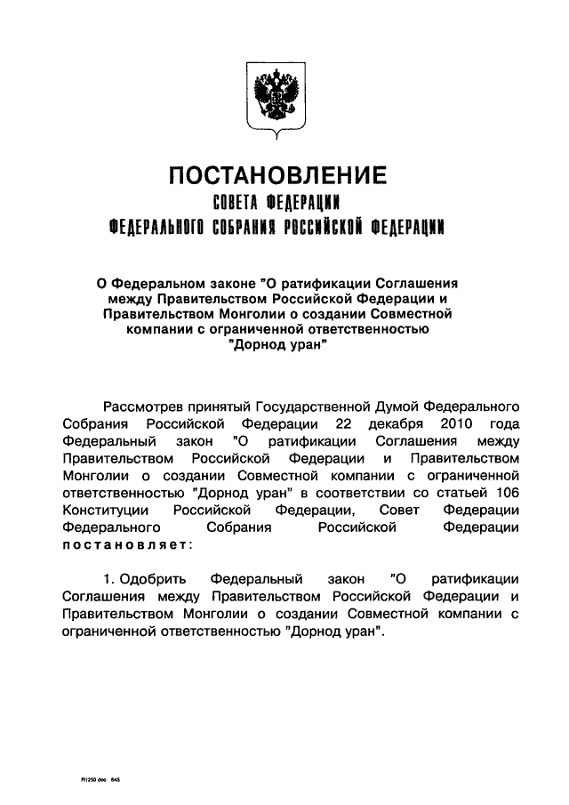 "О ФЕДЕРАЛЬНОМ ЗАКОНЕ "О РАТИФИКАЦИИ СОГЛАШЕНИЯ МЕЖДУ ПРАВИТЕЛЬСТВОМ РОССИЙСКОЙ ФЕДЕРАЦИИ И ПРАВИТЕЛЬСТВОМ МОНГОЛИИ О СОЗДАНИИ СОВМЕСТНОЙ КОМПАНИИ С ОГРАНИЧЕННОЙ ОТВЕТСТВЕННОСТЬЮ "ДОРНОД УРАН"