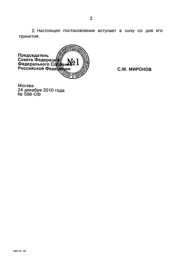 ПОСТАНОВЛЕНИЕ СФ ФС РФ от 24.12.2010 N 599-СФ