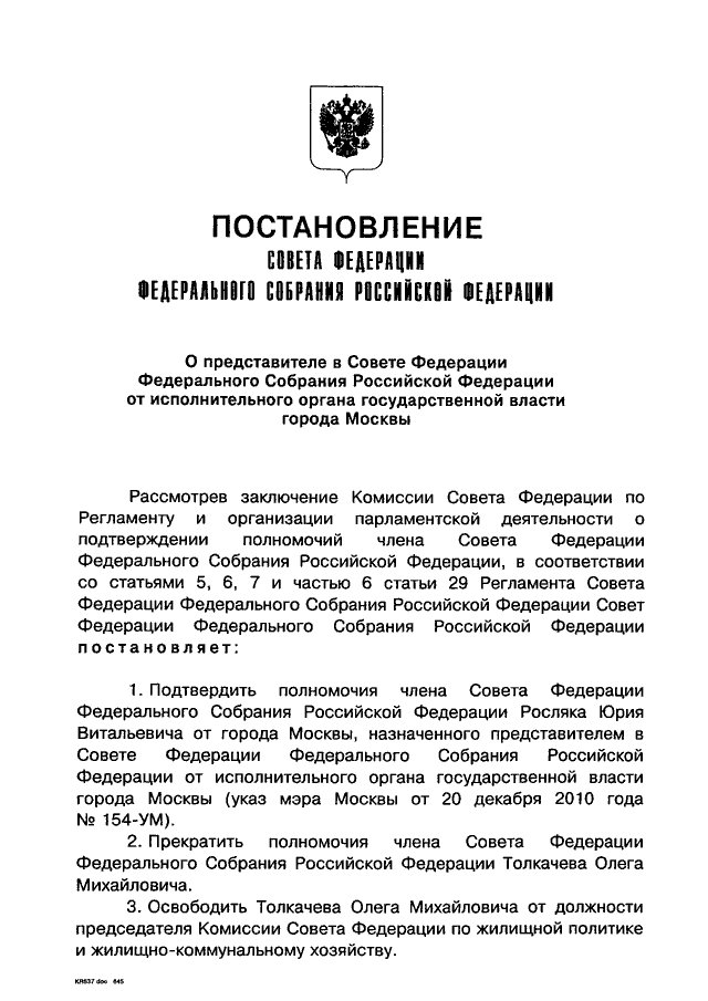 "О ПРЕДСТАВИТЕЛЕ В СОВЕТЕ ФЕДЕРАЦИИ ФЕДЕРАЛЬНОГО СОБРАНИЯ РОССИЙСКОЙ ФЕДЕРАЦИИ ОТ ИСПОЛНИТЕЛЬНОГО ОРГАНА ГОСУДАРСТВЕННОЙ ВЛАСТИ ГОРОДА МОСКВЫ"