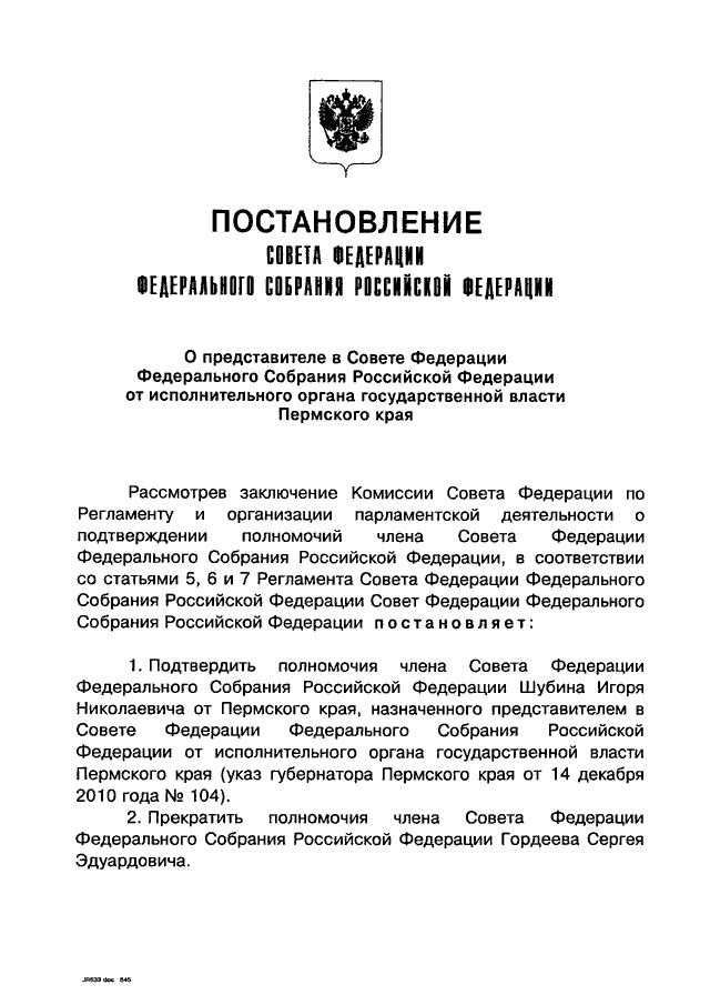 "О ПРЕДСТАВИТЕЛЕ В СОВЕТЕ ФЕДЕРАЦИИ ФЕДЕРАЛЬНОГО СОБРАНИЯ РОССИЙСКОЙ ФЕДЕРАЦИИ ОТ ИСПОЛНИТЕЛЬНОГО ОРГАНА ГОСУДАРСТВЕННОЙ ВЛАСТИ ПЕРМСКОГО КРАЯ"