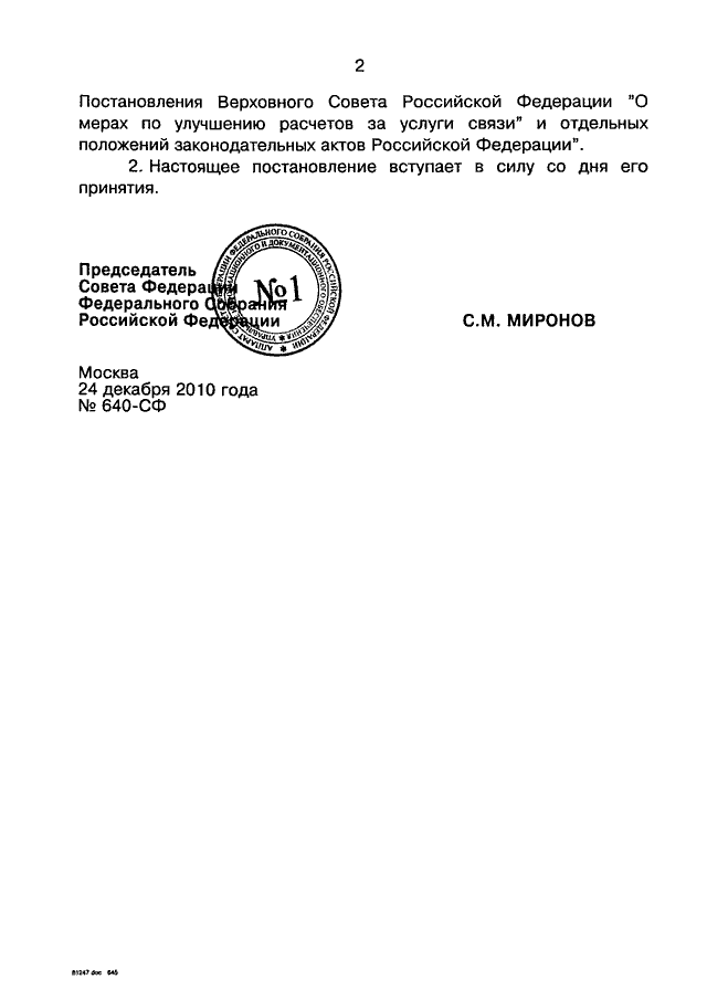 ПОСТАНОВЛЕНИЕ СФ ФС РФ от 24.12.2010 N 640-СФ