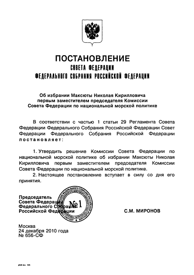 "ОБ ИЗБРАНИИ МАКСЮТЫ НИКОЛАЯ КИРИЛЛОВИЧА ПЕРВЫМ ЗАМЕСТИТЕЛЕМ ПРЕДСЕДАТЕЛЯ КОМИССИИ СОВЕТА ФЕДЕРАЦИИ ПО НАЦИОНАЛЬНОЙ МОРСКОЙ ПОЛИТИКЕ"