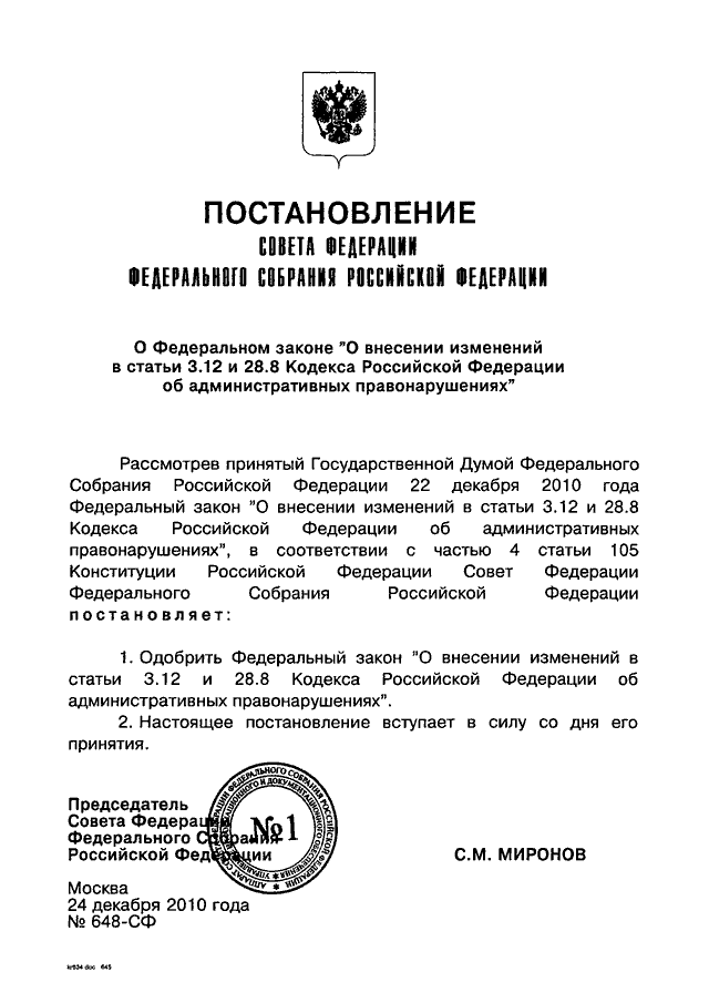 ПОСТАНОВЛЕНИЕ СФ ФС РФ от 24.12.2010 N 648-СФ
