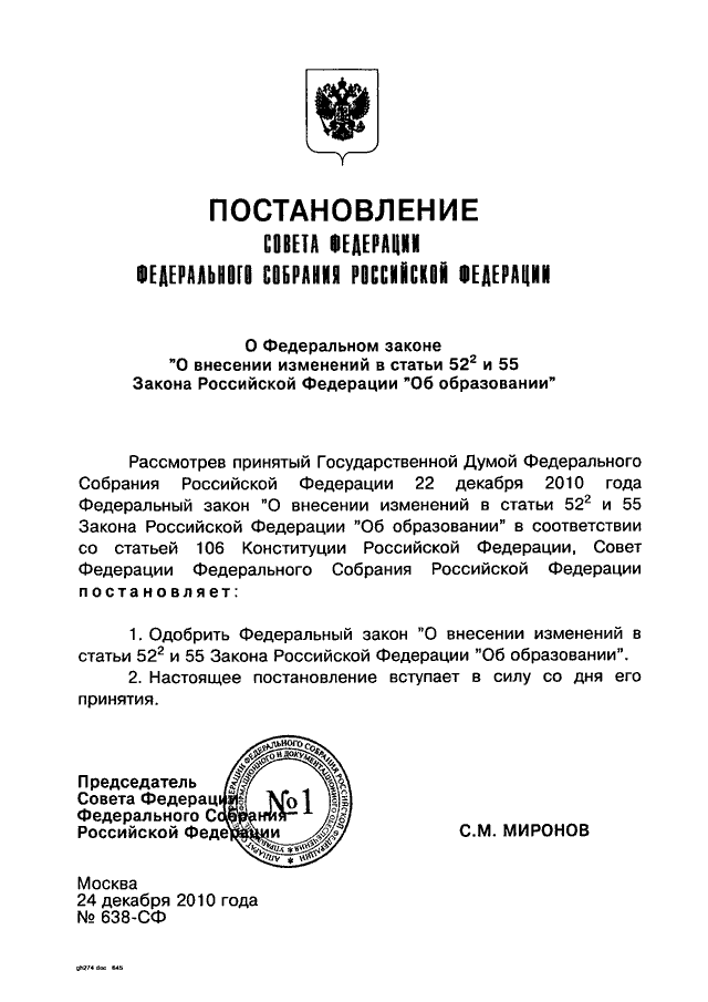 ПОСТАНОВЛЕНИЕ СФ ФС РФ от 24.12.2010 N 638-СФ