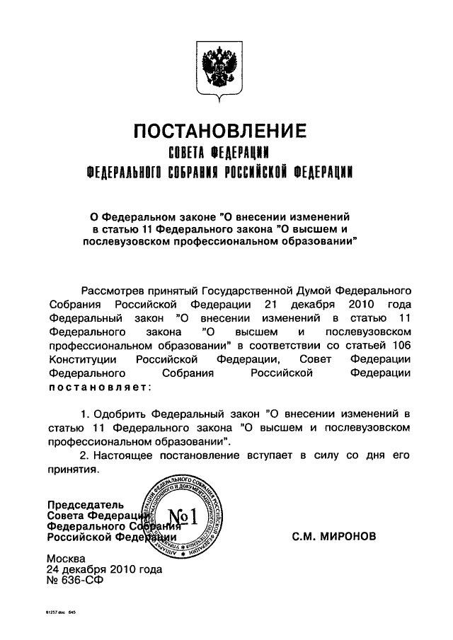 ПОСТАНОВЛЕНИЕ СФ ФС РФ от 24.12.2010 N 636-СФ