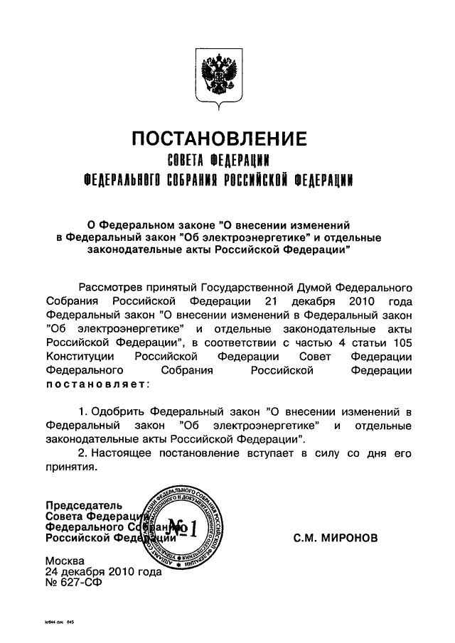 ПОСТАНОВЛЕНИЕ СФ ФС РФ от 24.12.2010 N 627-СФ