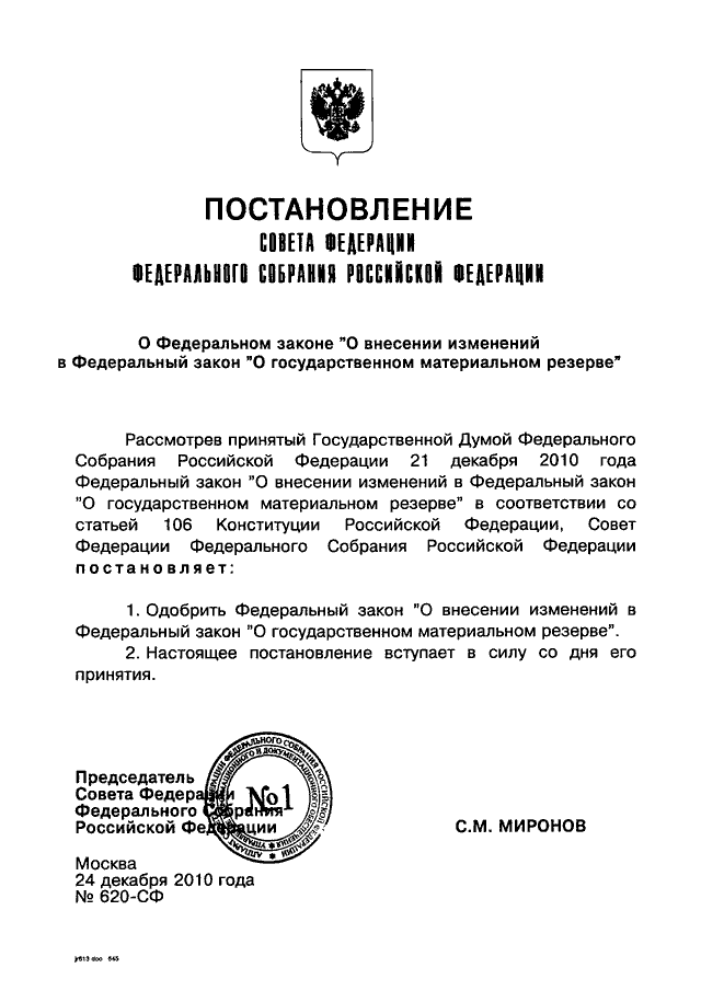 ПОСТАНОВЛЕНИЕ СФ ФС РФ от 24.12.2010 N 620-СФ