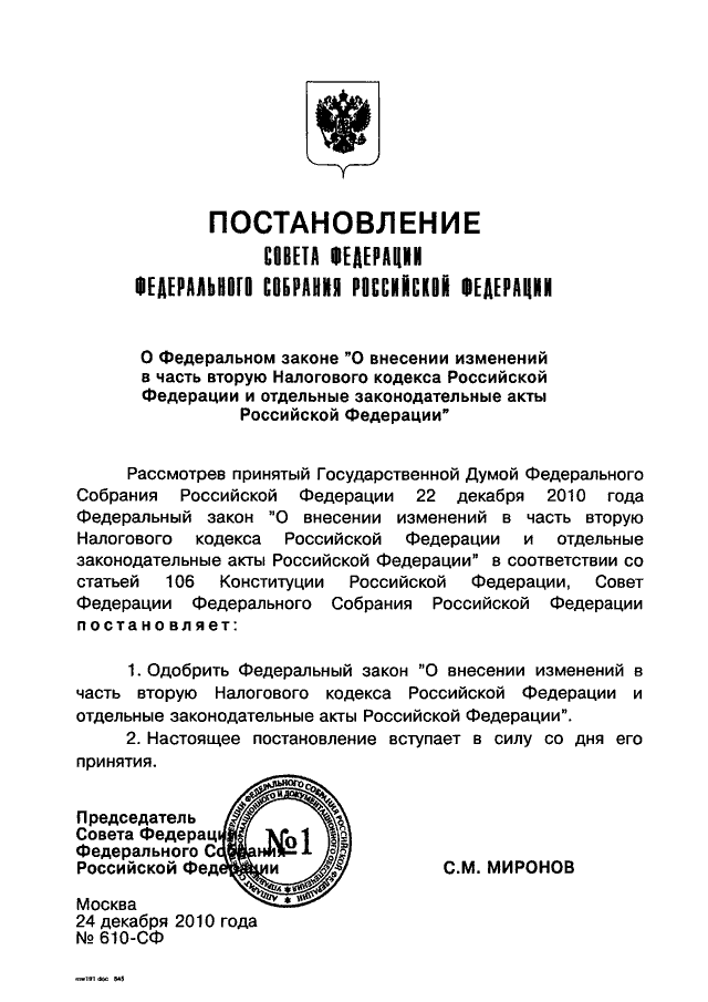 ПОСТАНОВЛЕНИЕ СФ ФС РФ от 24.12.2010 N 610-СФ