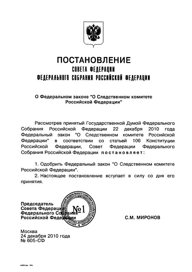 ПОСТАНОВЛЕНИЕ СФ ФС РФ от 24.12.2010 N 605-СФ