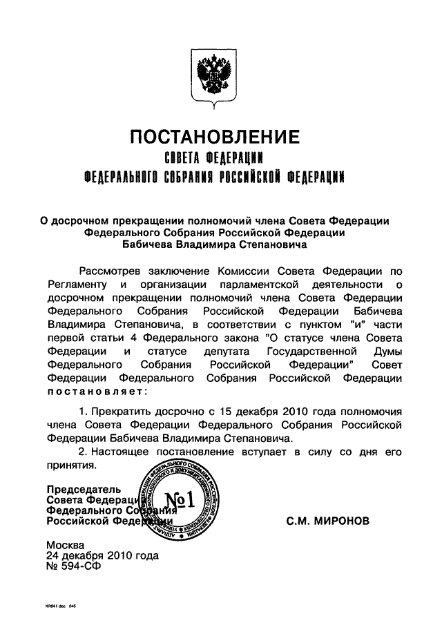 "О ДОСРОЧНОМ ПРЕКРАЩЕНИИ ПОЛНОМОЧИЙ ЧЛЕНА СОВЕТА ФЕДЕРАЦИИ ФЕДЕРАЛЬНОГО СОБРАНИЯ РОССИЙСКОЙ ФЕДЕРАЦИИ БАБИЧЕВА ВЛАДИМИРА СТЕПАНОВИЧА"