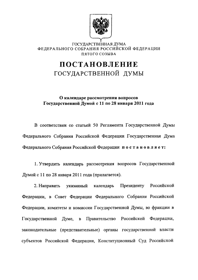 "О КАЛЕНДАРЕ РАССМОТРЕНИЯ ВОПРОСОВ ГОСУДАРСТВЕННОЙ ДУМОЙ С 11 ПО 28 ЯНВАРЯ 2011 ГОДА"