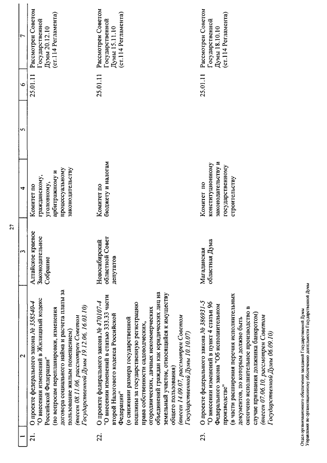 "О КАЛЕНДАРЕ РАССМОТРЕНИЯ ВОПРОСОВ ГОСУДАРСТВЕННОЙ ДУМОЙ С 11 ПО 28 ЯНВАРЯ 2011 ГОДА"