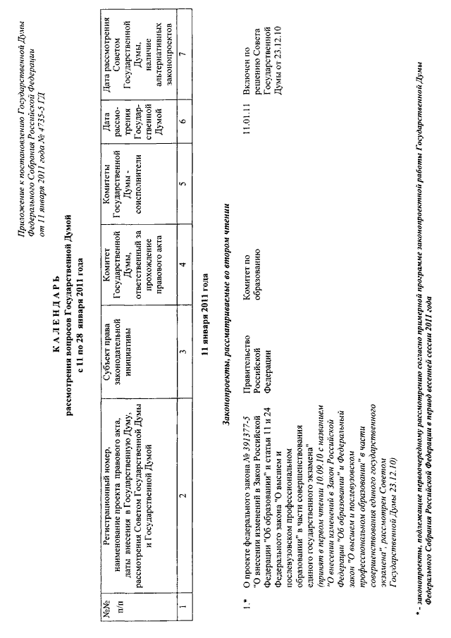 "О КАЛЕНДАРЕ РАССМОТРЕНИЯ ВОПРОСОВ ГОСУДАРСТВЕННОЙ ДУМОЙ С 11 ПО 28 ЯНВАРЯ 2011 ГОДА"