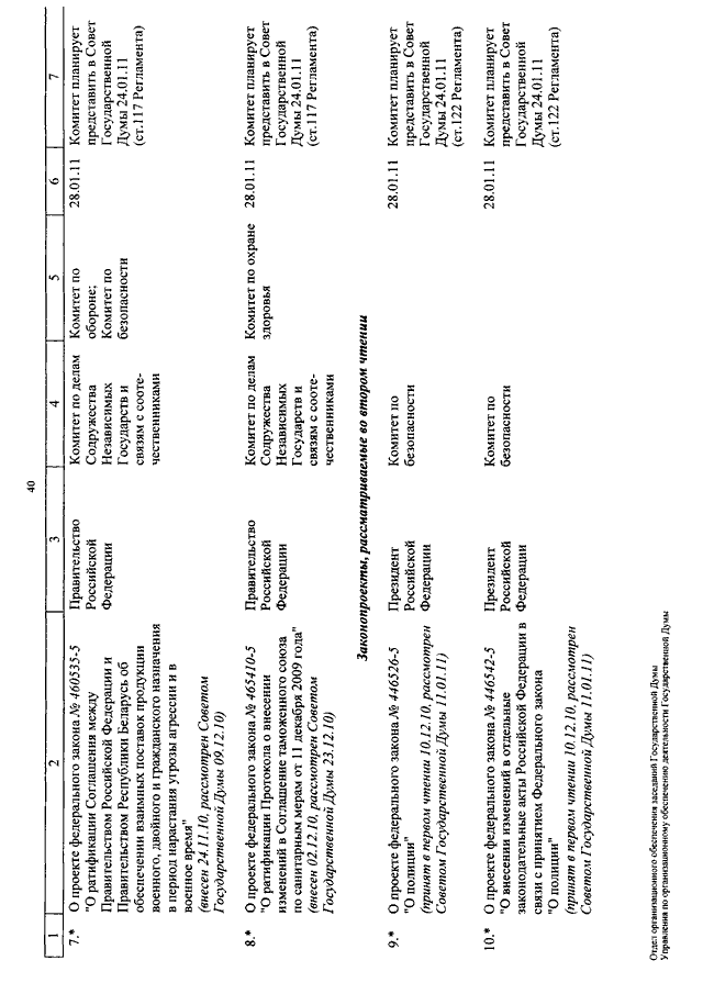 "О КАЛЕНДАРЕ РАССМОТРЕНИЯ ВОПРОСОВ ГОСУДАРСТВЕННОЙ ДУМОЙ С 11 ПО 28 ЯНВАРЯ 2011 ГОДА"