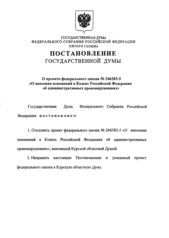 "О ПРОЕКТЕ ФЕДЕРАЛЬНОГО ЗАКОНА N 246383-5 "О ВНЕСЕНИИ ИЗМЕНЕНИЙ В КОДЕКС РОССИЙСКОЙ ФЕДЕРАЦИИ ОБ АДМИНИСТРАТИВНЫХ ПРАВОНАРУШЕНИЯХ"