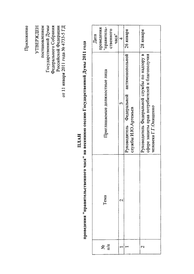 "О ПЛАНЕ ПРОВЕДЕНИЯ "ПРАВИТЕЛЬСТВЕННОГО ЧАСА" НА ВЕСЕННЮЮ СЕССИЮ ГОСУДАРСТВЕННОЙ ДУМЫ 2011 ГОДА"