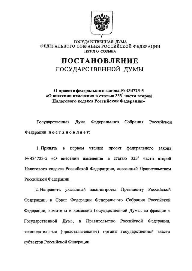 "О ПРОЕКТЕ ФЕДЕРАЛЬНОГО ЗАКОНА N 434723-5 "О ВНЕСЕНИИ ИЗМЕНЕНИЯ В СТАТЬЮ 333.3 ЧАСТИ ВТОРОЙ НАЛОГОВОГО КОДЕКСА РОССИЙСКОЙ ФЕДЕРАЦИИ"