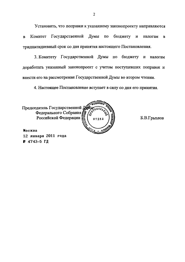 ПОСТАНОВЛЕНИЕ ГД ФС РФ от 12.01.2011 N 4743-5 ГД