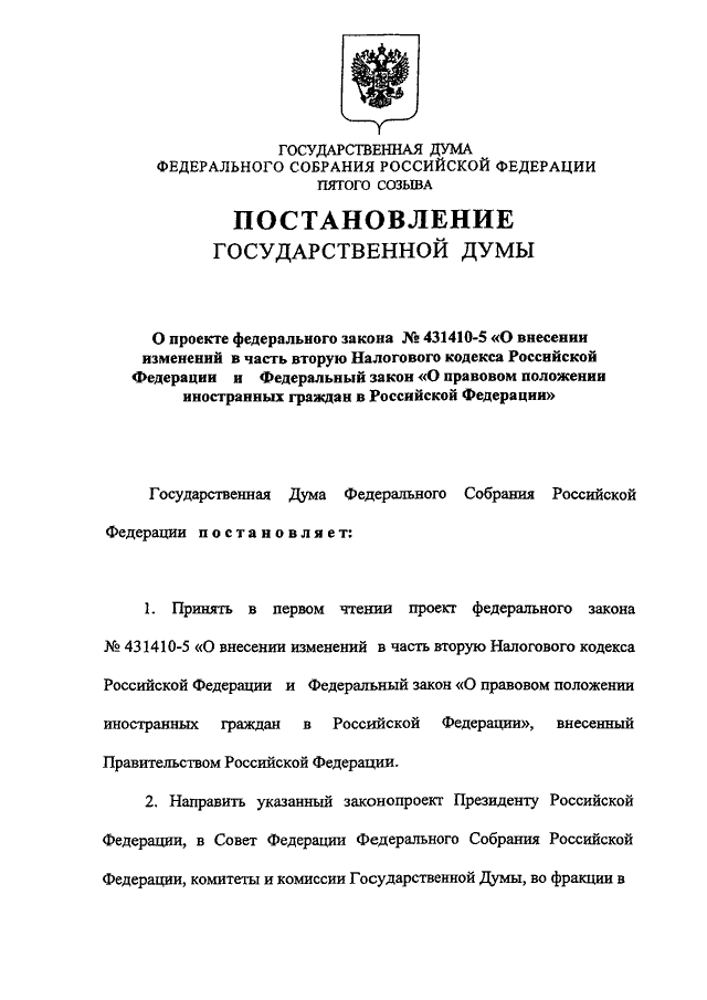 "О ПРОЕКТЕ ФЕДЕРАЛЬНОГО ЗАКОНА N 431410-5 "О ВНЕСЕНИИ ИЗМЕНЕНИЙ В ЧАСТЬ ВТОРУЮ НАЛОГОВОГО КОДЕКСА РОССИЙСКОЙ ФЕДЕРАЦИИ И ФЕДЕРАЛЬНЫЙ ЗАКОН "О ПРАВОВОМ ПОЛОЖЕНИИ ИНОСТРАННЫХ ГРАЖДАН В РОССИЙСКОЙ ФЕДЕРАЦИИ"