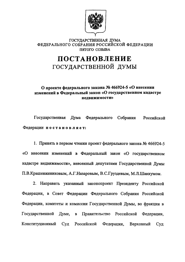 "О ПРОЕКТЕ ФЕДЕРАЛЬНОГО ЗАКОНА N 466924-5 "О ВНЕСЕНИИ ИЗМЕНЕНИЙ В ФЕДЕРАЛЬНЫЙ ЗАКОН "О ГОСУДАРСТВЕННОМ КАДАСТРЕ НЕДВИЖИМОСТИ"