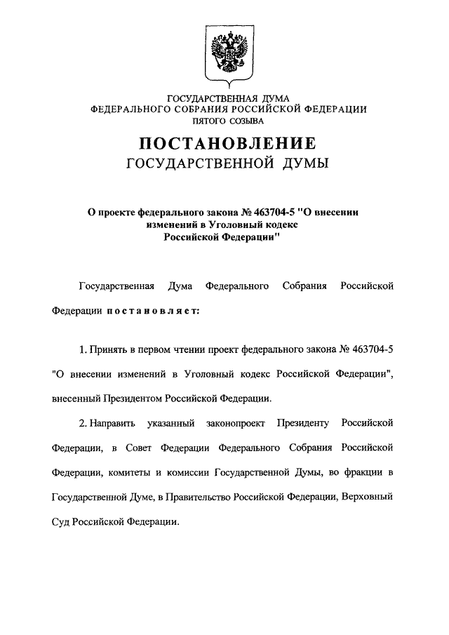 "О ПРОЕКТЕ ФЕДЕРАЛЬНОГО ЗАКОНА N 463704-5 "О ВНЕСЕНИИ ИЗМЕНЕНИЙ В УГОЛОВНЫЙ КОДЕКС РОССИЙСКОЙ ФЕДЕРАЦИИ"