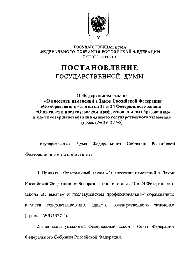 "О ФЕДЕРАЛЬНОМ ЗАКОНЕ "О ВНЕСЕНИИ ИЗМЕНЕНИЙ В ЗАКОН РОССИЙСКОЙ ФЕДЕРАЦИИ "ОБ ОБРАЗОВАНИИ" И СТАТЬИ 11 И 24 ФЕДЕРАЛЬНОГО ЗАКОНА "О ВЫСШЕМ И ПОСЛЕВУЗОВСКОМ ПРОФЕССИОНАЛЬНОМ ОБРАЗОВАНИИ" В ЧАСТИ СОВЕРШЕНСТВОВАНИЯ ЕДИНОГО ГОСУДАРСТВЕННОГО ЭКЗАМЕНА" (ПРОЕКТ N 391377-5)"