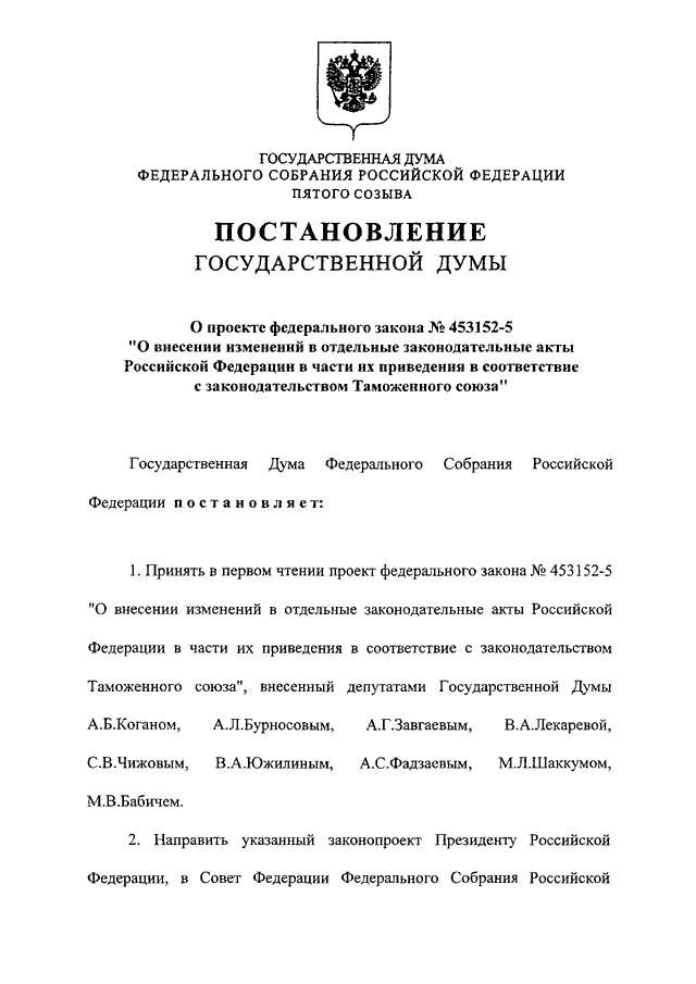 "О ПРОЕКТЕ ФЕДЕРАЛЬНОГО ЗАКОНА N 453152-5 "О ВНЕСЕНИИ ИЗМЕНЕНИЙ В ОТДЕЛЬНЫЕ ЗАКОНОДАТЕЛЬНЫЕ АКТЫ РОССИЙСКОЙ ФЕДЕРАЦИИ В ЧАСТИ ИХ ПРИВЕДЕНИЯ В СООТВЕТСТВИЕ С ЗАКОНОДАТЕЛЬСТВОМ ТАМОЖЕННОГО СОЮЗА"