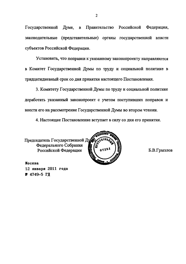 ПОСТАНОВЛЕНИЕ ГД ФС РФ от 12.01.2011 N 4749-5 ГД