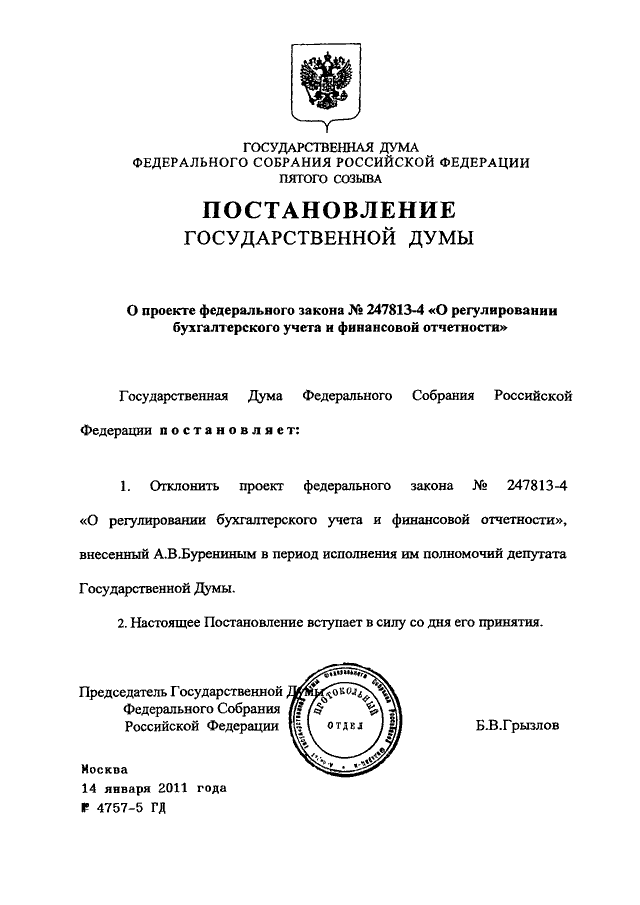 ПОСТАНОВЛЕНИЕ ГД ФС РФ от 14.01.2011 N 4757-5 ГД