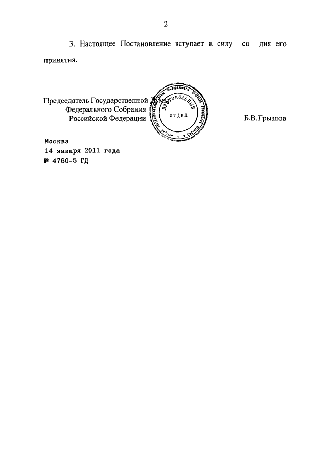 ПОСТАНОВЛЕНИЕ ГД ФС РФ от 14.01.2011 N 4760-5 ГД