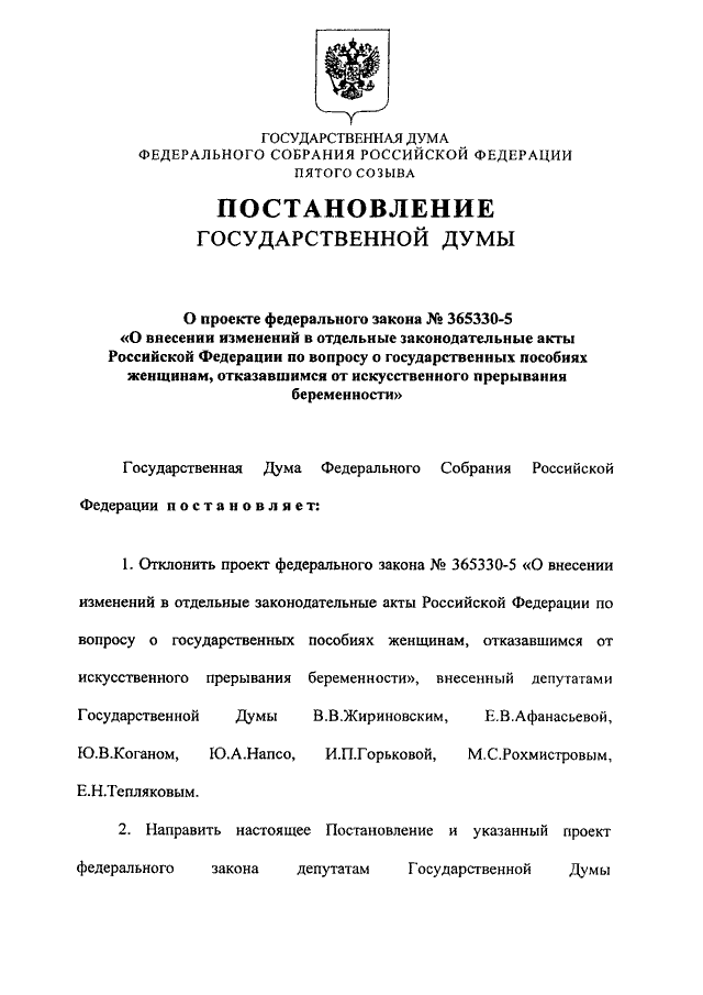 "О ПРОЕКТЕ ФЕДЕРАЛЬНОГО ЗАКОНА N 365330-5 "О ВНЕСЕНИИ ИЗМЕНЕНИЙ В ОТДЕЛЬНЫЕ ЗАКОНОДАТЕЛЬНЫЕ АКТЫ РОССИЙСКОЙ ФЕДЕРАЦИИ ПО ВОПРОСУ О ГОСУДАРСТВЕННЫХ ПОСОБИЯХ ЖЕНЩИНАМ, ОТКАЗАВШИМСЯ ОТ ИСКУССТВЕННОГО ПРЕРЫВАНИЯ БЕРЕМЕННОСТИ"