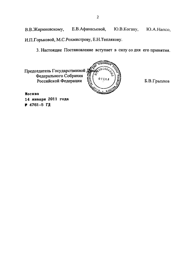 ПОСТАНОВЛЕНИЕ ГД ФС РФ от 14.01.2011 N 4761-5 ГД