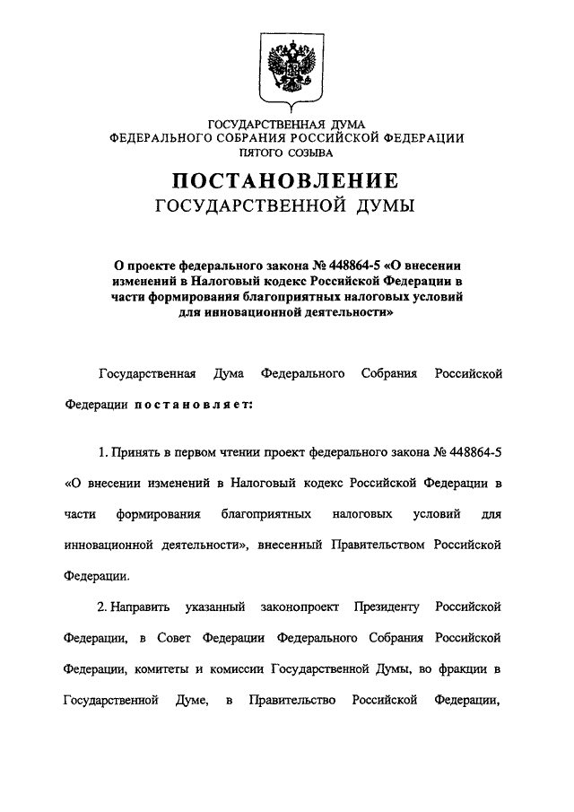 "О ПРОЕКТЕ ФЕДЕРАЛЬНОГО ЗАКОНА N 448864-5 "О ВНЕСЕНИИ ИЗМЕНЕНИЙ В НАЛОГОВЫЙ КОДЕКС РОССИЙСКОЙ ФЕДЕРАЦИИ В ЧАСТИ ФОРМИРОВАНИЯ БЛАГОПРИЯТНЫХ НАЛОГОВЫХ УСЛОВИЙ ДЛЯ ИННОВАЦИОННОЙ ДЕЯТЕЛЬНОСТИ"