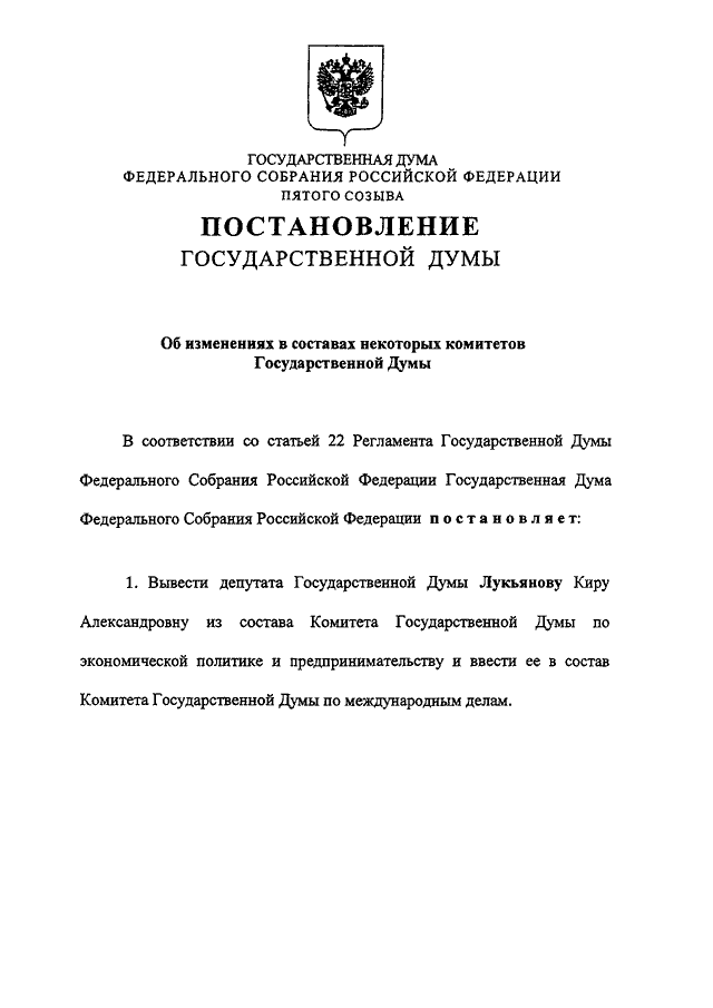 "ОБ ИЗМЕНЕНИЯХ В СОСТАВАХ НЕКОТОРЫХ КОМИТЕТОВ ГОСУДАРСТВЕННОЙ ДУМЫ"