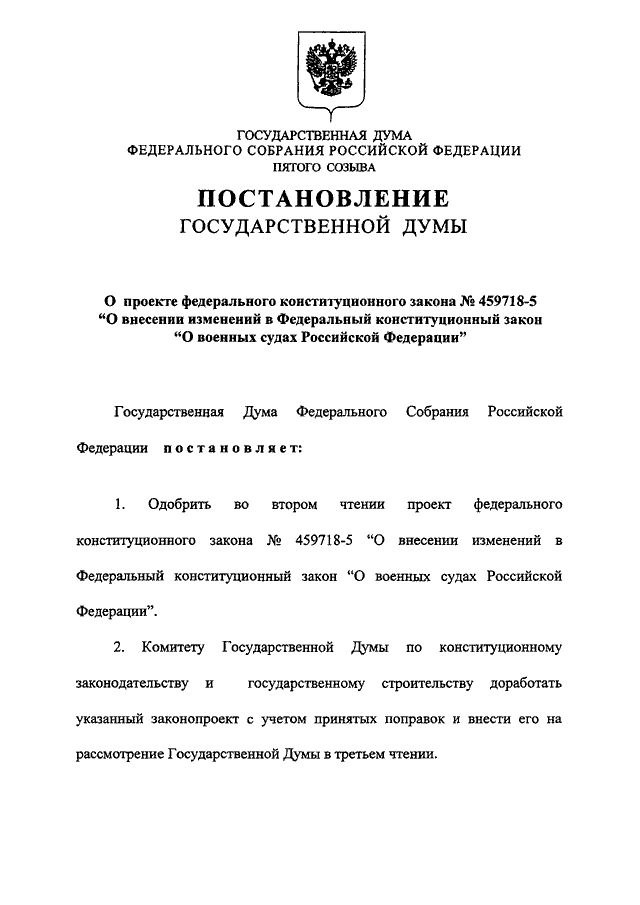 "О ПРОЕКТЕ ФЕДЕРАЛЬНОГО КОНСТИТУЦИОННОГО ЗАКОНА N 459718-5 "О ВНЕСЕНИИ ИЗМЕНЕНИЙ В ФЕДЕРАЛЬНЫЙ КОНСТИТУЦИОННЫЙ ЗАКОН "О ВОЕННЫХ СУДАХ РОССИЙСКОЙ ФЕДЕРАЦИИ"