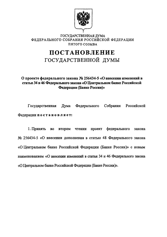 "О ПРОЕКТЕ ФЕДЕРАЛЬНОГО ЗАКОНА N 256434-5 "О ВНЕСЕНИИ ИЗМЕНЕНИЙ В СТАТЬИ 34 И 46 ФЕДЕРАЛЬНОГО ЗАКОНА "О ЦЕНТРАЛЬНОМ БАНКЕ РОССИЙСКОЙ ФЕДЕРАЦИИ (БАНКЕ РОССИИ)"