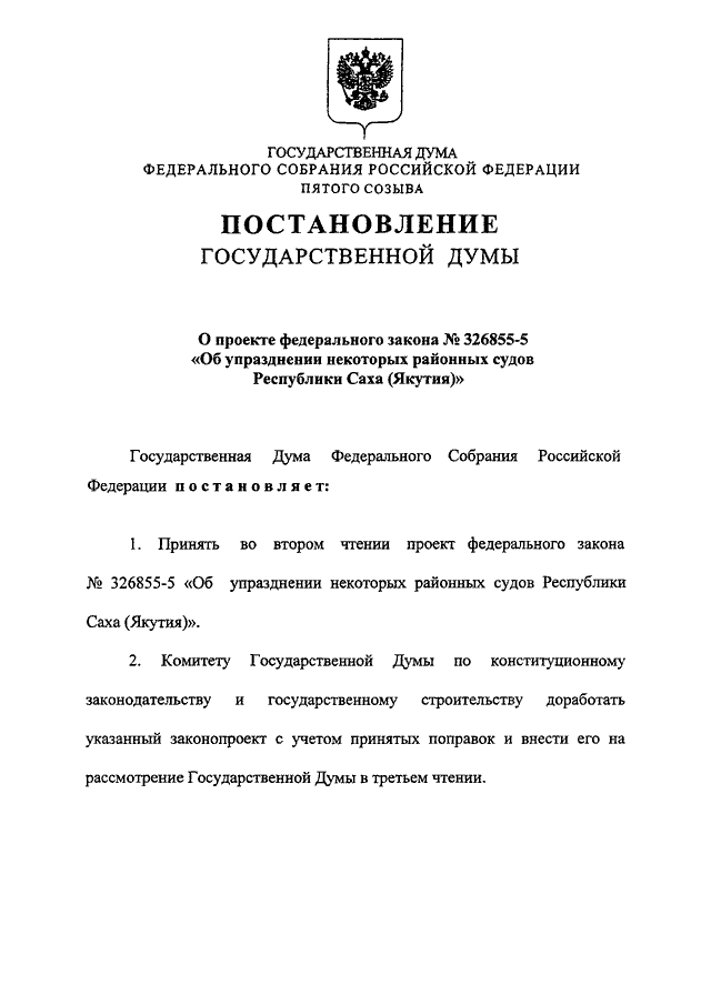 "О ПРОЕКТЕ ФЕДЕРАЛЬНОГО ЗАКОНА N 326855-5 "ОБ УПРАЗДНЕНИИ НЕКОТОРЫХ РАЙОННЫХ СУДОВ РЕСПУБЛИКИ САХА (ЯКУТИЯ)"