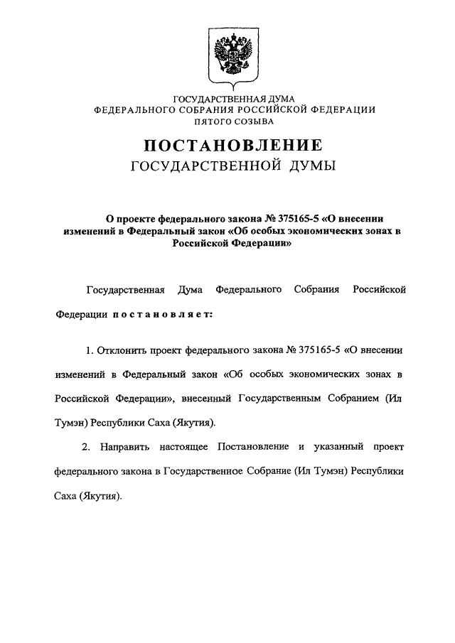 "О ПРОЕКТЕ ФЕДЕРАЛЬНОГО ЗАКОНА N 375165-5 "О ВНЕСЕНИИ ИЗМЕНЕНИЙ В ФЕДЕРАЛЬНЫЙ ЗАКОН "ОБ ОСОБЫХ ЭКОНОМИЧЕСКИХ ЗОНАХ В РОССИЙСКОЙ ФЕДЕРАЦИИ"