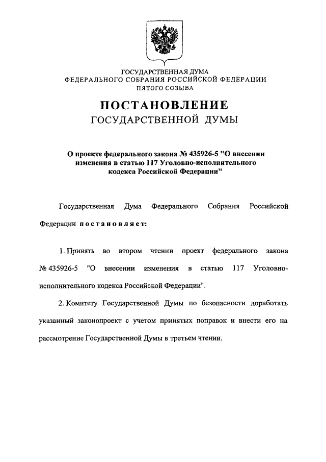 "О ПРОЕКТЕ ФЕДЕРАЛЬНОГО ЗАКОНА N 435926-5 "О ВНЕСЕНИИ ИЗМЕНЕНИЯ В СТАТЬЮ 117 УГОЛОВНО - ИСПОЛНИТЕЛЬНОГО КОДЕКСА РОССИЙСКОЙ ФЕДЕРАЦИИ"