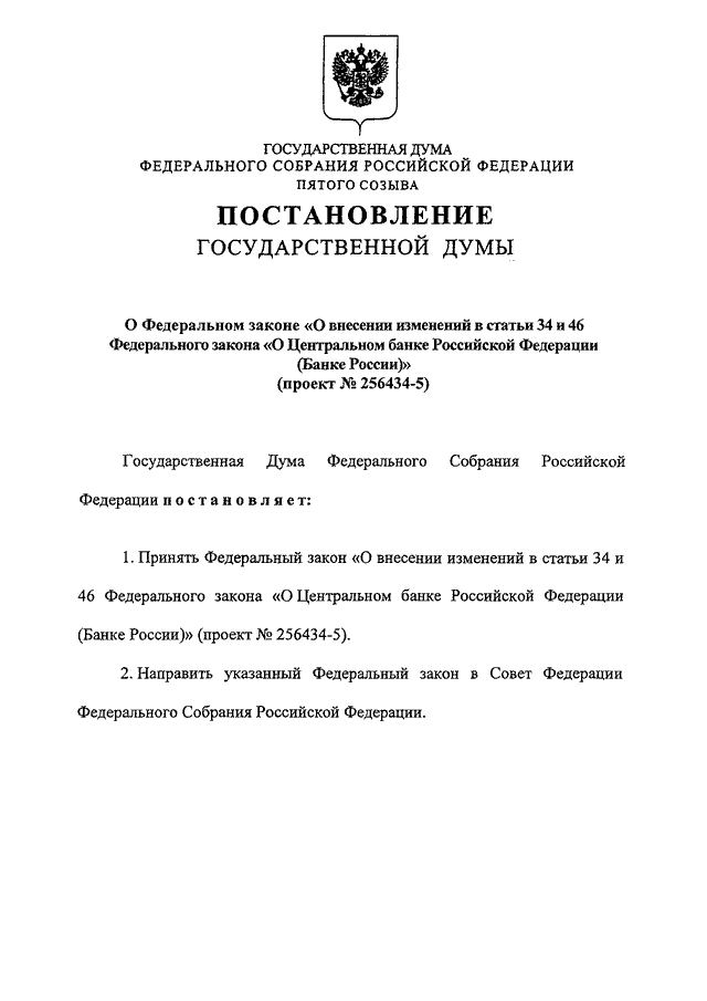 "О ФЕДЕРАЛЬНОМ ЗАКОНЕ "О ВНЕСЕНИИ ИЗМЕНЕНИЙ В СТАТЬИ 34 И 46 ФЕДЕРАЛЬНОГО ЗАКОНА "О ЦЕНТРАЛЬНОМ БАНКЕ РОССИЙСКОЙ ФЕДЕРАЦИИ (БАНКЕ РОССИИ)" (ПРОЕКТ N 256434-5)"