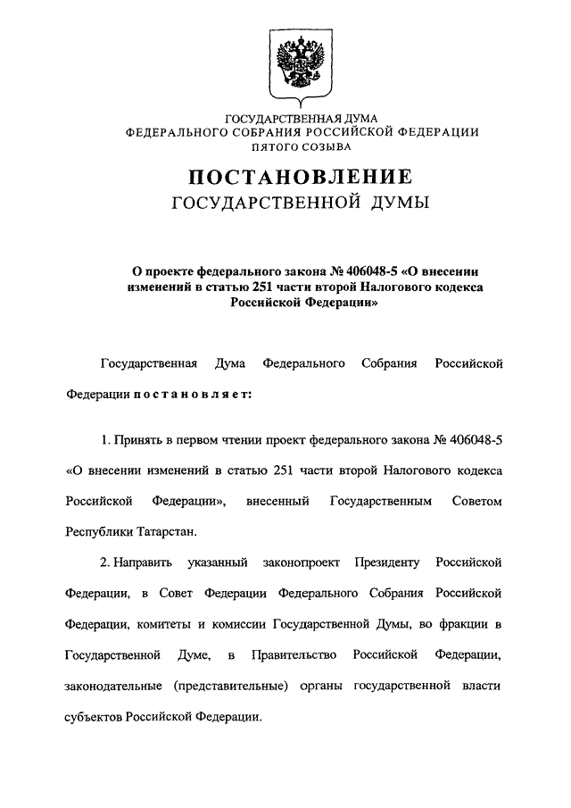 "О ПРОЕКТЕ ФЕДЕРАЛЬНОГО ЗАКОНА N 406048-5 "О ВНЕСЕНИИ ИЗМЕНЕНИЙ В СТАТЬЮ 251 ЧАСТИ ВТОРОЙ НАЛОГОВОГО КОДЕКСА РОССИЙСКОЙ ФЕДЕРАЦИИ"