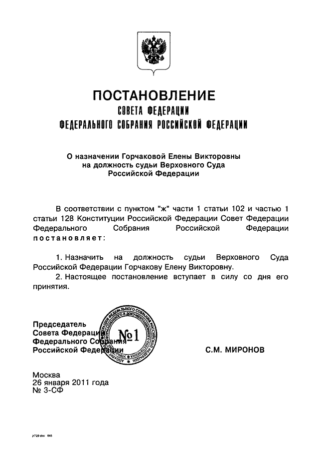"О НАЗНАЧЕНИИ ГОРЧАКОВОЙ ЕЛЕНЫ ВИКТОРОВНЫ НА ДОЛЖНОСТЬ СУДЬИ ВЕРХОВНОГО СУДА РОССИЙСКОЙ ФЕДЕРАЦИИ"