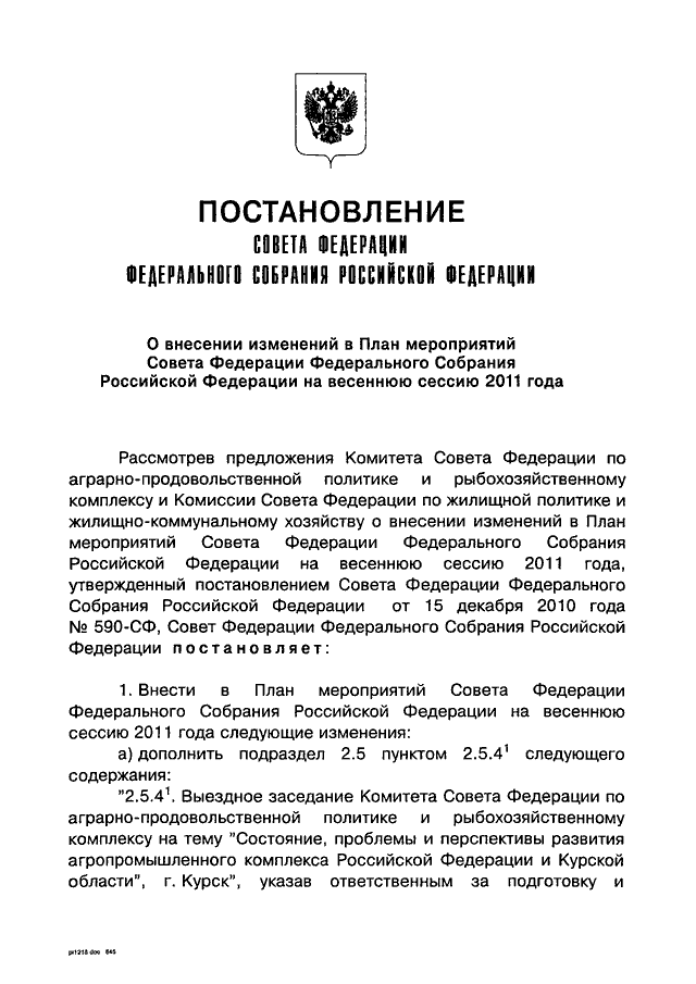 "О ВНЕСЕНИИ ИЗМЕНЕНИЙ В ПЛАН МЕРОПРИЯТИЙ СОВЕТА ФЕДЕРАЦИИ ФЕДЕРАЛЬНОГО СОБРАНИЯ РОССИЙСКОЙ ФЕДЕРАЦИИ НА ВЕСЕННЮЮ СЕССИЮ 2011 ГОДА"