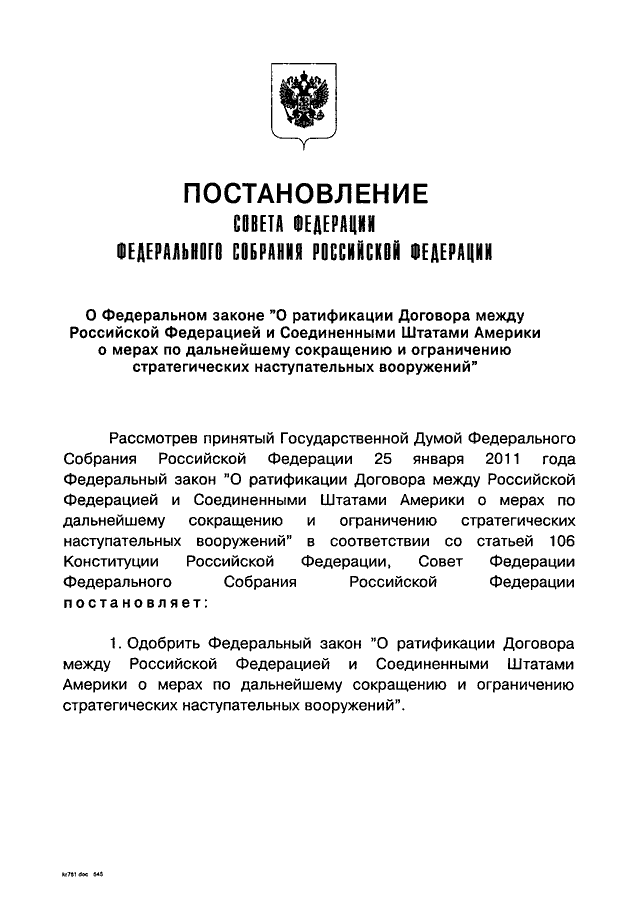 "О ФЕДЕРАЛЬНОМ ЗАКОНЕ "О РАТИФИКАЦИИ ДОГОВОРА МЕЖДУ РОССИЙСКОЙ ФЕДЕРАЦИЕЙ И СОЕДИНЕННЫМИ ШТАТАМИ АМЕРИКИ О МЕРАХ ПО ДАЛЬНЕЙШЕМУ СОКРАЩЕНИЮ И ОГРАНИЧЕНИЮ СТРАТЕГИЧЕСКИХ НАСТУПАТЕЛЬНЫХ ВООРУЖЕНИЙ"