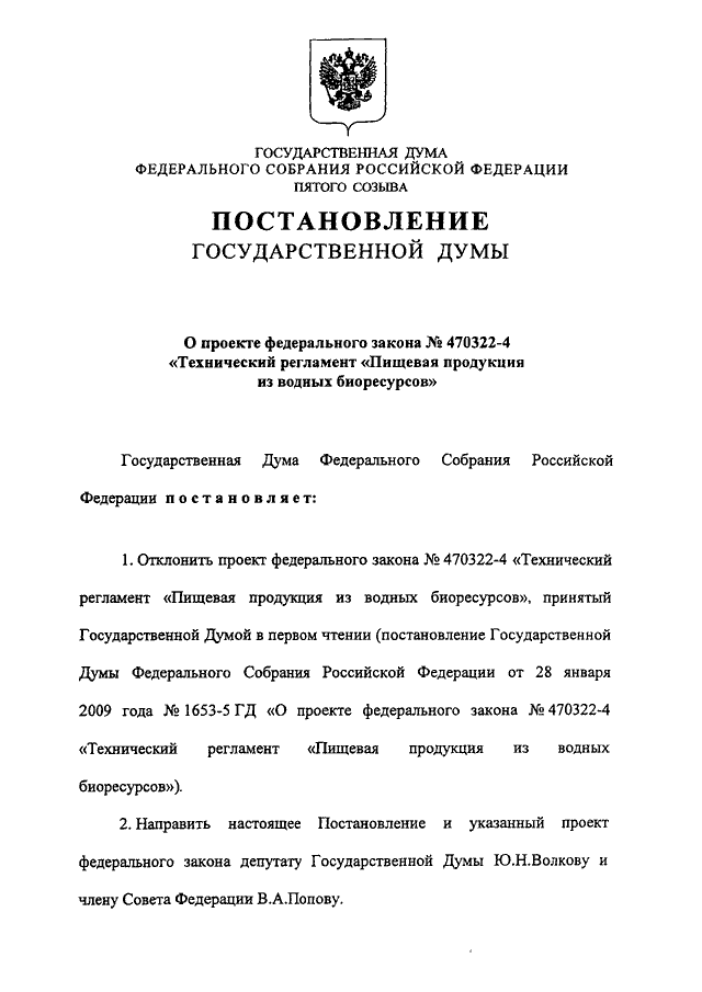 "О ПРОЕКТЕ ФЕДЕРАЛЬНОГО ЗАКОНА N 470322-4 "ТЕХНИЧЕСКИЙ РЕГЛАМЕНТ "ПИЩЕВАЯ ПРОДУКЦИЯ ИЗ ВОДНЫХ БИОРЕСУРСОВ"