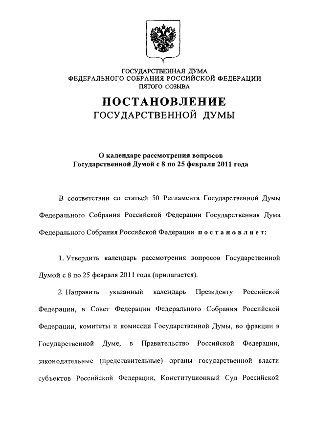 "О КАЛЕНДАРЕ РАССМОТРЕНИЯ ВОПРОСОВ ГОСУДАРСТВЕННОЙ ДУМОЙ С 8 ПО 25 ФЕВРАЛЯ 2011 ГОДА"